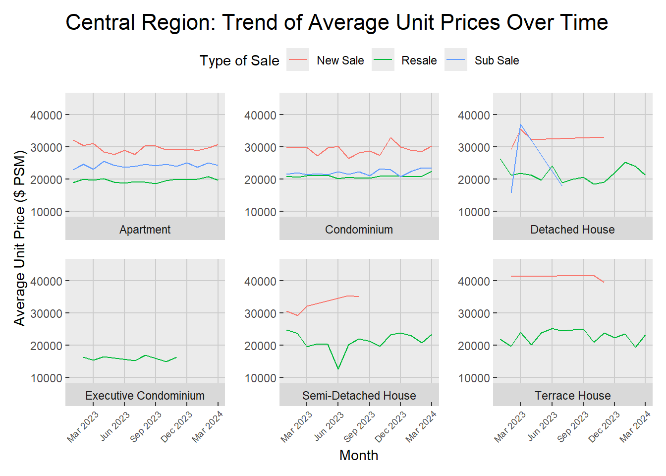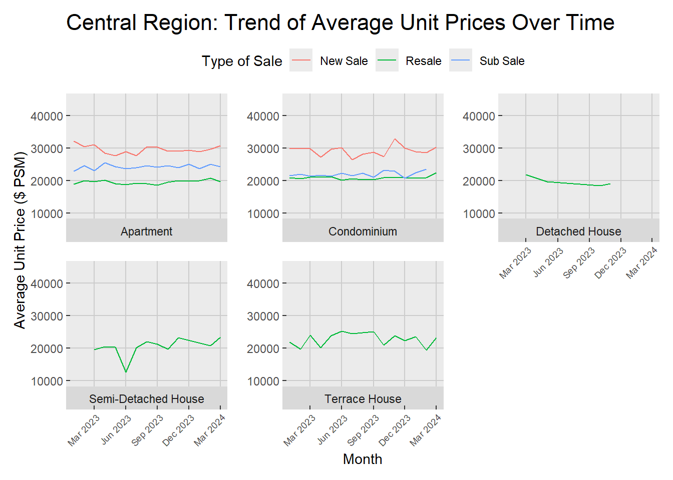 In the Central Region, Q1 2024 presents a stable pricing pattern for apartments, condominiums, and terrace houses, mirroring trends from the previous year. Conversely, detached houses experienced a significant rise in prices, followed by a pronounced dip, particularly within the sub-sale segment, which has now narrowed down to only resale transactions. It shows there was flutuation under Executive condominiums from March to December 2023, culminating in a complete absence of new sales in the subsequent quarter. Meanwhile, semi-detached houses witnessed a singular decline in June 2023, after which prices entered a gradual and steady climb, indicating a stabilizing market as progress through 2024.