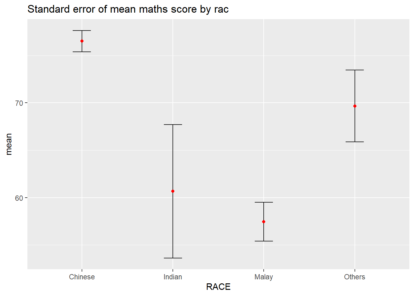 ggtitle("Standard error of mean maths score by rac")Warning: Using `size` aesthetic for lines was deprecated in ggplot2 3.4.0.